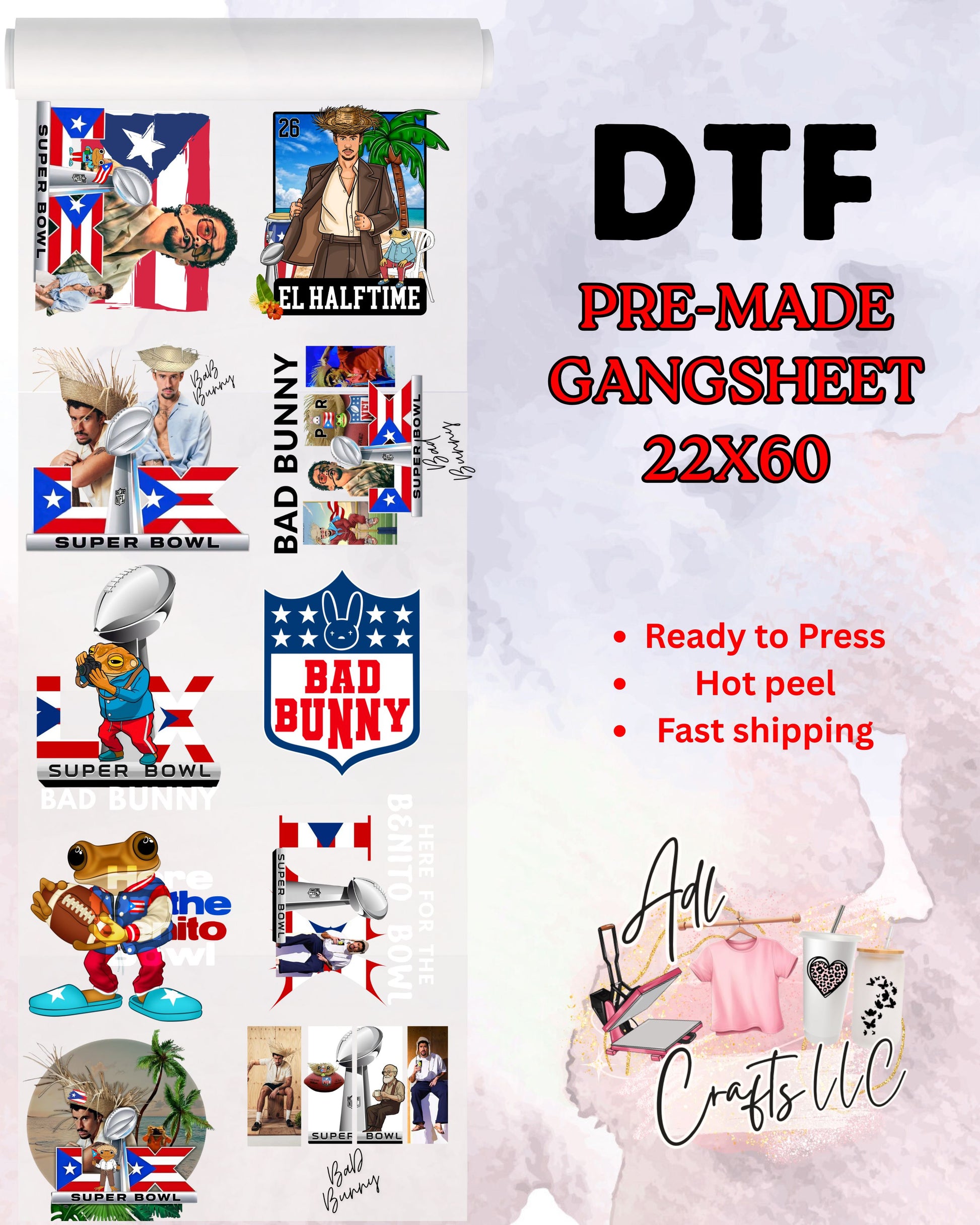 Upgrade your apparel with high-quality HOT PEEL DTF transfers — no designing, no cutting, no weeding. These premade gang sheets are printed, packaged, and ready to press straight onto your garments. Perfect for shirts, hoodies, hats, bags, small business merch, and one-time events.